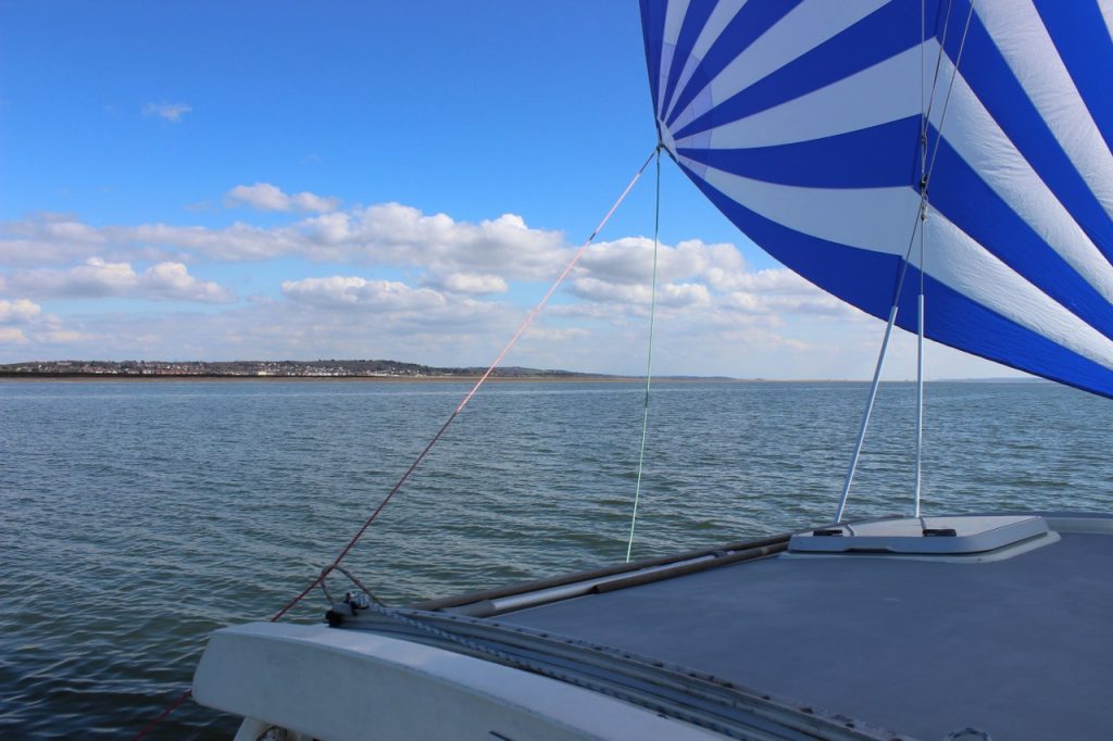 We made our approach into the Dee via the East Hoyle Bank channel at low tide. At 14:10, as we passed ‘HE3’ buoy the sand bank was high and dry several metres on the other side. It was then a slow (2 knots) dead run up the Dee passing Hilbre Island and West Kirby with the main and cruising chute goose winged, in lovely sunshine.