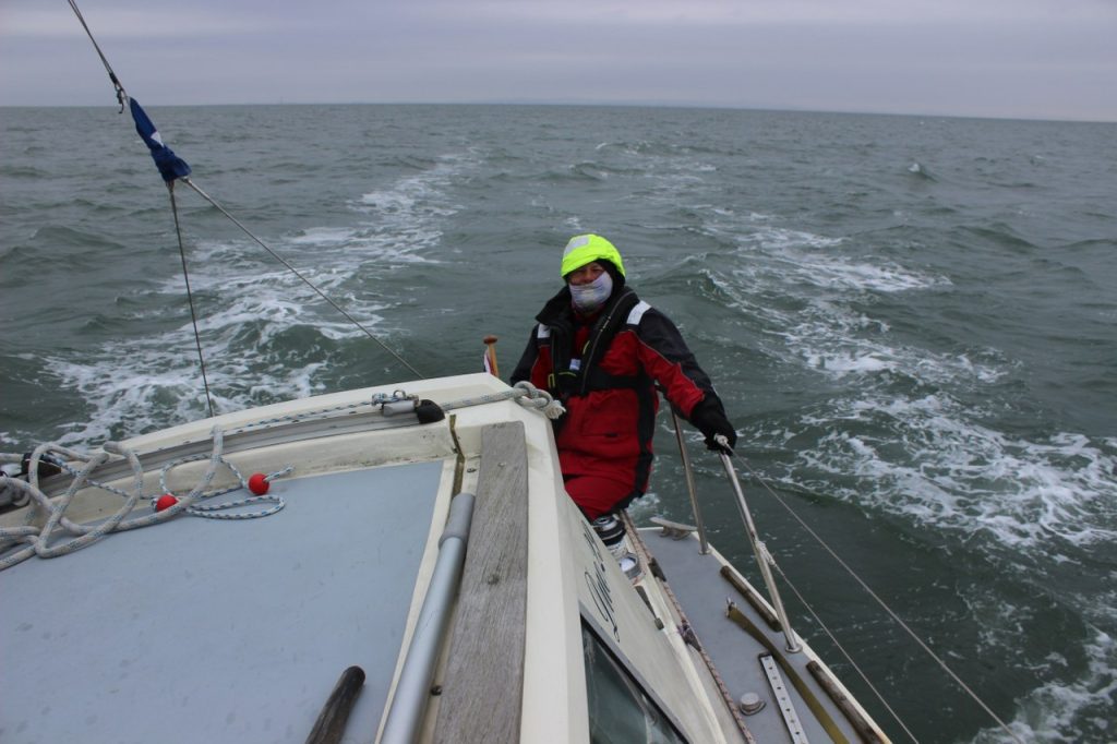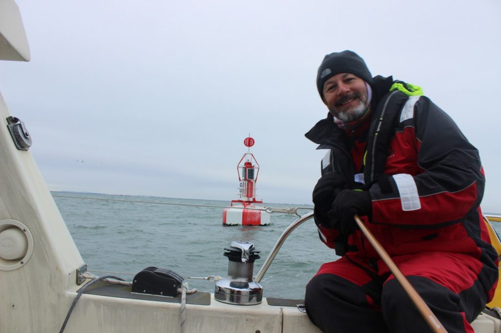 On Sunday, at 04:30 the wind filled in from the south-southeast. By 04:51, the anchor was up, the main and genoa were goosewinged, and we were heading north. We reached the ‘Bar’ light vessel at 07:00 with the wind force 4 and building. Bacon rolls had already been cooked and eaten. We set a course for the ‘Gut’ buoy and reached there at 5/6 knots, arriving at 09:01. Three buoys completed.
